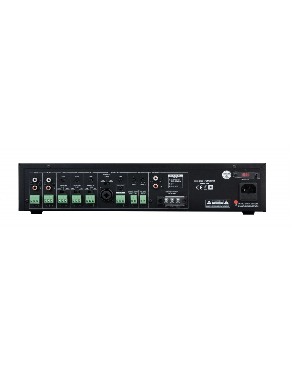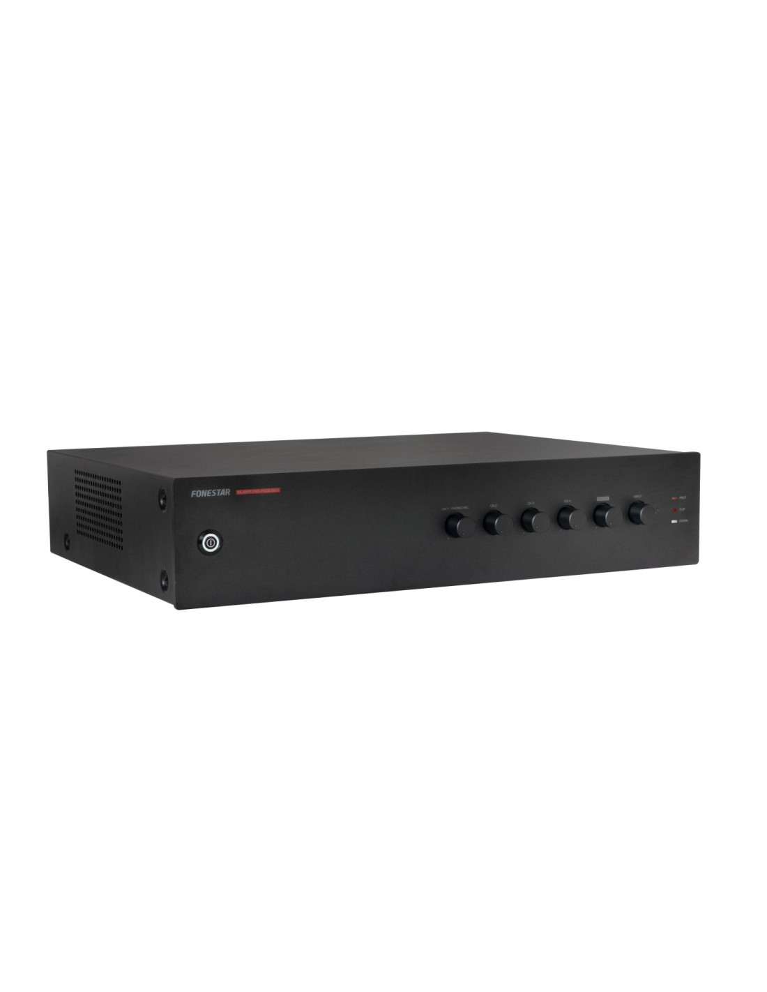 Lo strumento migliore per l'installazione audio in un locale. Affidabile per lunghe giornate lavorative. Audio distribuito per impianti PA con altoparlanti 100 V, anche con uscita a bassa impedenza. Funzionamento intuitivo e design moderno e discreto. Una soluzione adatta a qualsiasi budget. Connessioni sicure e durevoli con bassa manutenzione.Perfetto per sistemi di diffusione sonora e musica in filodiffusione con altoparlanti di linea da 100 V o a bassa impedenza. Negozi, centri educativi, monumenti, mostre, bar, ristoranti, ecc.CARATTERISTICHE: Amplificatore PAIngressi microfonici con controllo di mix, guadagno e livello di priorità.Priorità di ingresso per livello di segnale.Controlli di tono.Uscite 100 V e 4 Ω.POTENZA: 240 W RMSRISPOSTA: 60-20.000 Hz (-10 dB)DISTORSIONE: THD+N: < 1% a 1 kHzRAPPORTO S/N: >77dBPROTEZIONI: Sovracorrente, CC e cortocircuito in uscitaINGRESSI: Microfono/linea CH 1 bilanciato con Phantom 48V. Connettore combo (XLR + 6,3 mm) ed euroblockCH 2, 3 e 4 bilanciati mic/line con phantom a 48V. Connettore EuroblockLivello segnale microfono: 6 mV RMS (-44 dBV) / 600 ΩLivello segnale linea: 250 mV RMS (-12 dBV) / 100k Ω2 AUX. 2 connettori RCA ed euroblock. Livello del segnale 300 mV RMS (-10 dBV) / 47.000 Ω1 emergenza. Connettore Euroblock. Livello segnale linea altoparlanti 100 V1 Mute (priorità emergenza) tramite chiusura contatto. Connettore EuroblockUSCITE: 1 riga. 2 connettori RCA. Livello segnale 1,25 V RMS (+2 dBV)Uscita altoparlante 100 V o 4 Ω. Terminali a vite del connettoreIMPEDENZA: Linea 4 Ω e 100 V (166 Ω)FUNZIONI: Priorità di ingresso (ingressi Voice over VOX):100 V Ingresso di emergenza con massima priorità, attenua tutti gli altri ingressi.Muto per chiusura contatto, attenua tutti gli ingressi tranne l'ingresso di emergenza 100 V.Canale 1 con priorità su tutti gli altri ingressi, livello selezionabile.Canale 2 con priorità sugli ingressi ausiliari, livello selezionabile.Altre funzioni:Spie di accensione, protezione, segnale di picco e segnale di uscita.Raffreddamento a induzione senza ventolaCONTROLLI: Volume microfonoSelettore microfono/linea/phantomVolume principaleSelettore ingresso AuxTono: bassi e alti (+/- 10 dB 100 Hz e 10k Hz)Guadagno microfonoLivello segnale di attivazione prioritaria (VOX)TEMPERATURA DI ESERCIZIO: Funzionamento: 0º ~ 40ºCUMIDITÀ MASSIMA: 95%ALIMENTAZIONE ELETTRICA: 230/115 V CA 50-60 Hz, 200 WFusibile CA 230 V 1,5 A / 115 V 3,15 ADIMENSIONI: 433 x 89 x 360 mm di profondità. 2 U rack 19''PESO: 11,4 kgACCESSORI: Cavo di alimentazioneSupporti per rack