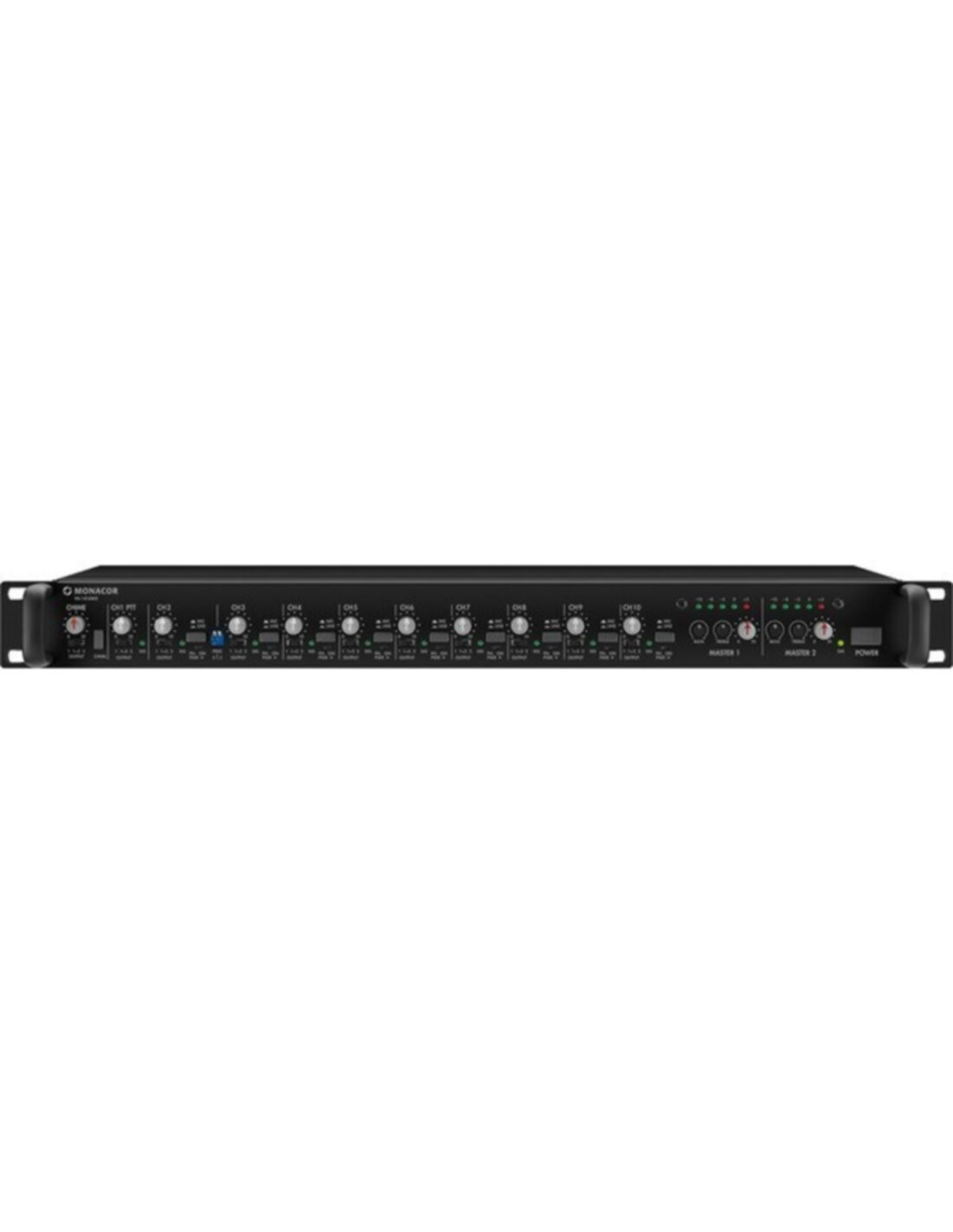 -Preamplificatore PA a 10 canali-5 canali d'ingresso XLR commutabili Mic/Line-4 canali d'ingresso commutabili XLR-Mic/RCA-Line-2 uscite master XLR-1 uscita Rec (Master1, Master2)-canali d'ingresso con regolazione livello e selettore uscita (Master1, -Master1+2, Master2)-regolazione toni delle uscite master con 2 frequenze diverse-pulsante gong con circuito prioritario, possibilità di telecomando, gong a 2 o a 4 toni, sirena regolabile-1 contatto PTT, RJ45, con circuito prioritario (p. es. per PA-4000PTT)-filtro Low-Cut attivabile per tutti gli ingressi microfono-circuito prioritario dei canali 2-3-alimentazione phantom per microfoni all'elettrete attivabile per ogni canale d'ingresso XLR-funzionamento a rete o a corrente d'emergenza 24 V