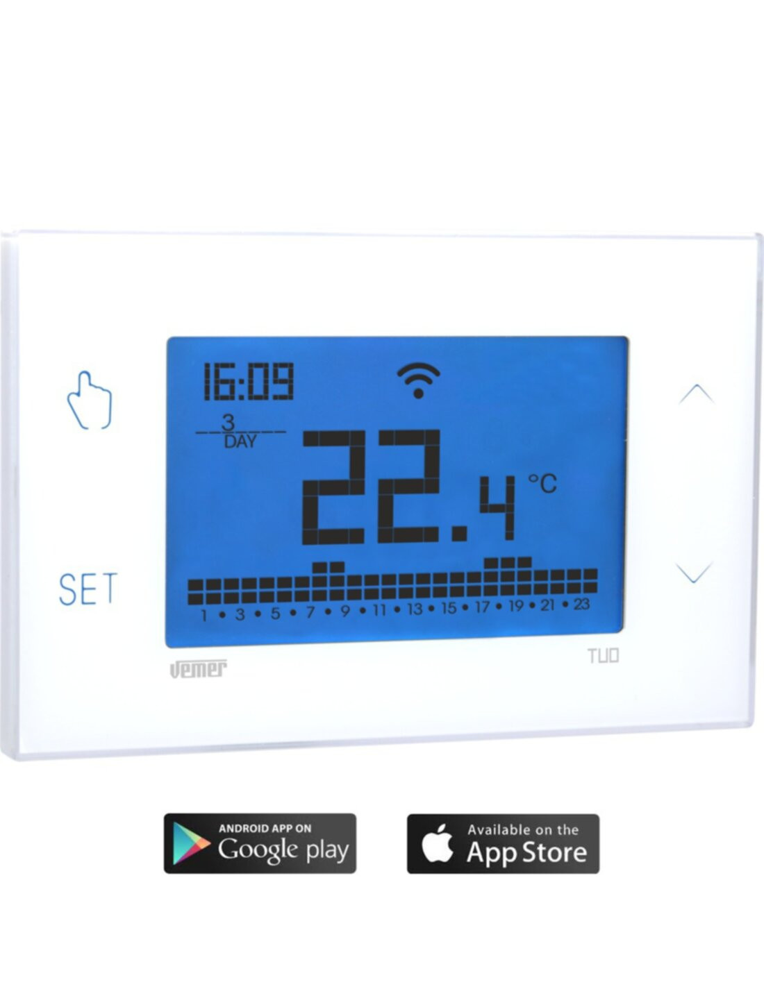 Cronotermostato touch screen wi-fi a batterie da parete con programmazione settimanale. Grazie al modulo wi-fi integrato è possibile gestire il cronotermostato da remoto tramite la app disponibile per smartphone e tablet iOS e Android. L'ampio display con retroilluminazione blu garantisce al prodotto eleganza e sobrietà. La funzione “blocco tastiera” con password, utile ad esempio per installazioni in luoghi pubblici, impedisce modifiche delle impostazioni a persone non autorizzate, mentre la funzione "blocco locale" consente il controllo del dispositivo esclusivamente con la app, rendendo così impossibili le modifiche delle impostazioni con la tastiera del dispositivo.Per una corretta configurazione del cronotermostato è fondamentale controllare che nelle impostazioni del router sia abilitata la banda di frequenza a 2,4 GHz. Le impostazioni di sicurezza del router devono inoltre essere impostate in WPA/WPA2 o WPA2.