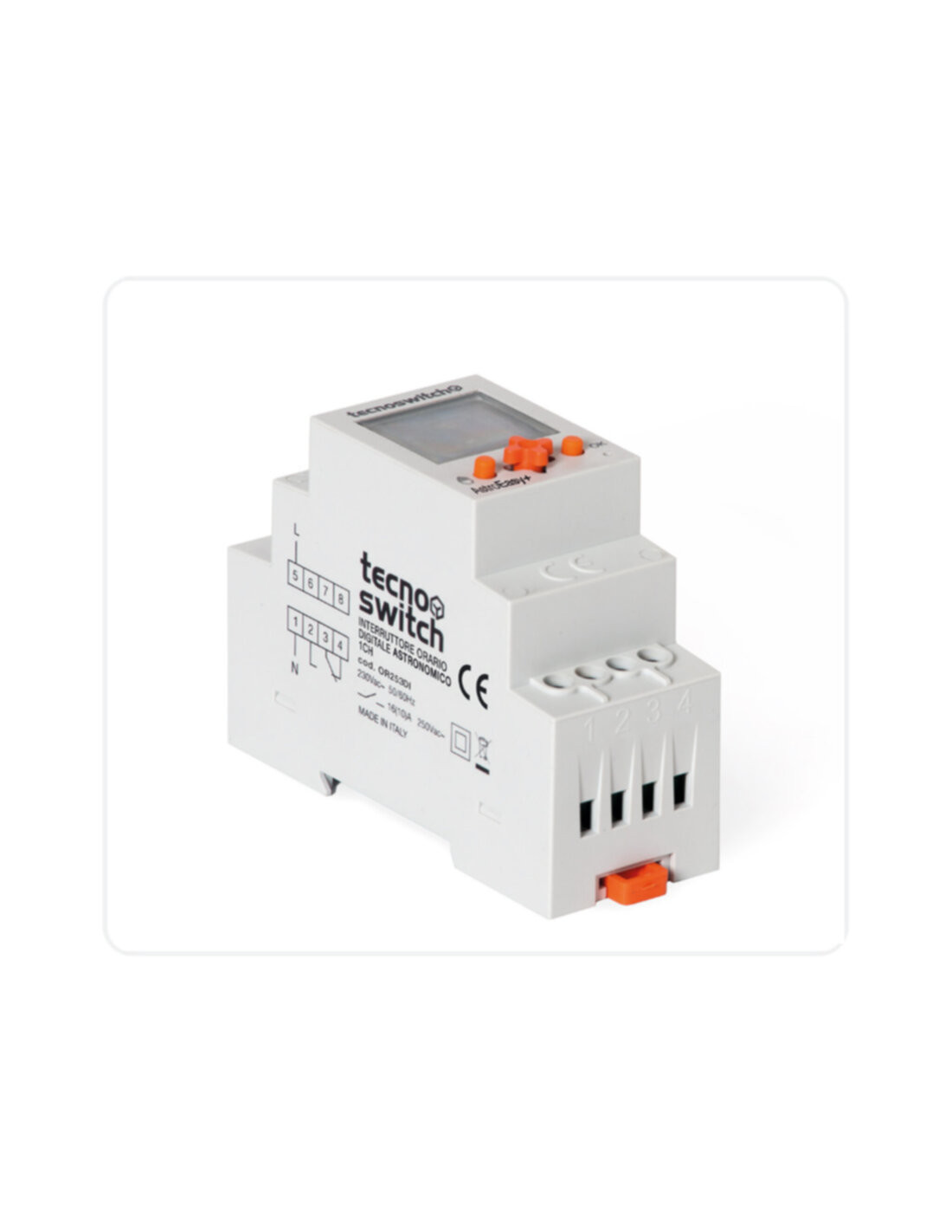 230 Vac, 50-60 HzInstallazione su guida DINContenitore modulare autoestinguente VOUscita relè in scambio 16APrecisione +- 1 sec/giorno a 24° CCambio automatico ora solare/legaleDisplay LCD retroilluminatoConfigurazione semplice ed intuitivaFunzionamento astronomico settimanaleVisualizzazione orario di alba e tramontoIntervallo minimo di programmazione 1/30 minMantenimento dati in assenza di rete fino a 20 giorni (Supercapacitor)Blocco con pin a 4 cifreCommutazione allo zero di tensione per prolungare la vita del relèFunzioni extra:– Esclusione giorni dalla funzione astronomica– Personalizzazione del programma astronomico– Offset, anticipo o ritardo alba e tramonto