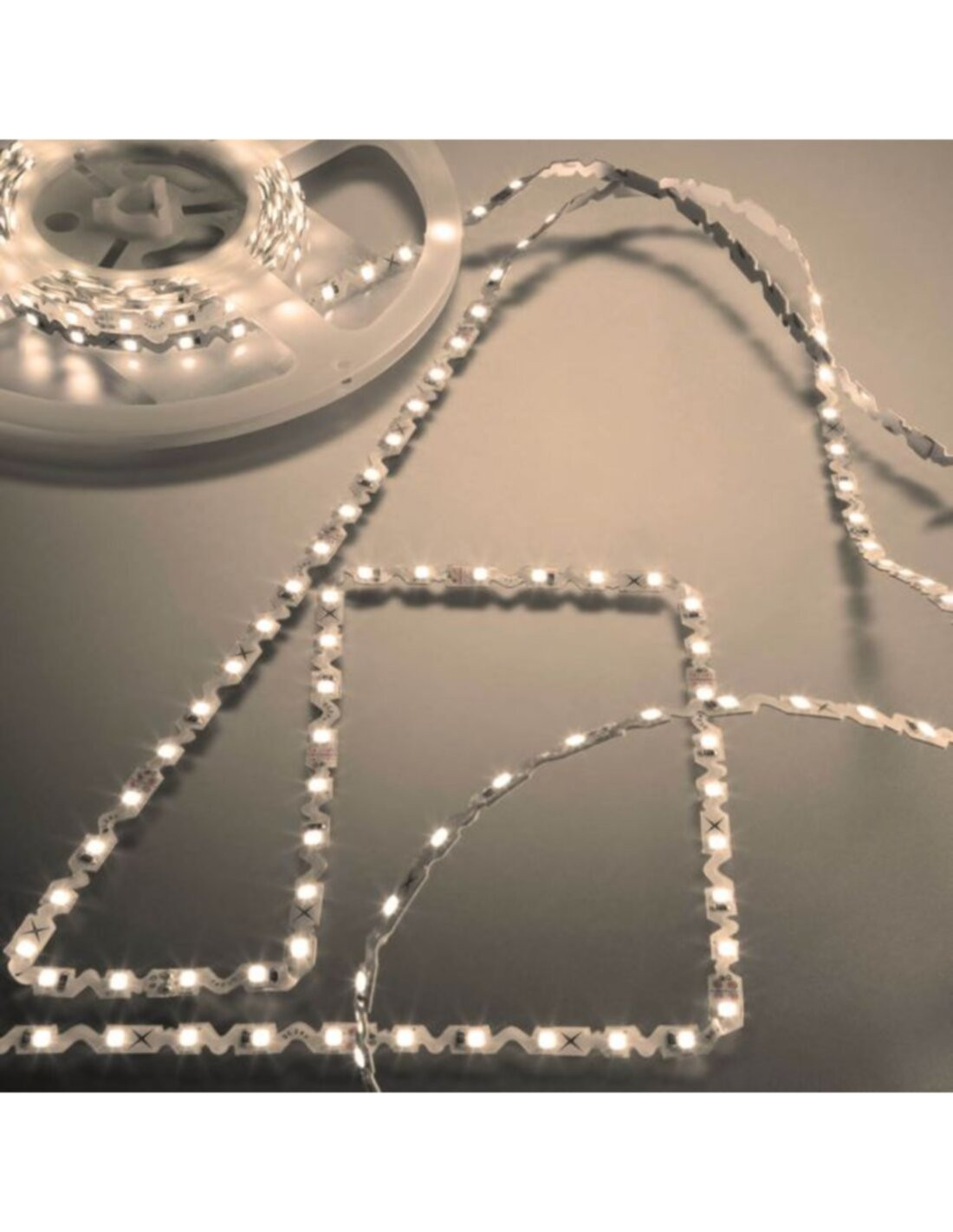 Striscia flessibile a LED tipo 2835 SMD, 72 LED/metro, luce bianco caldo, per ambienti umidi e esterni (IP65) con rivestimento protettivo in silicone anti UV, tecnologia nano. La forma a zig-zag del PCB permette una buona flessibilità anche orizzontalmente. Lunghezza totale 5m, sezionabile ogni 83,33 mm in gruppi di 6 LED o multipli. Fissaggio mediante biadesivo 3M (preapplicato sul retro della striscia).
