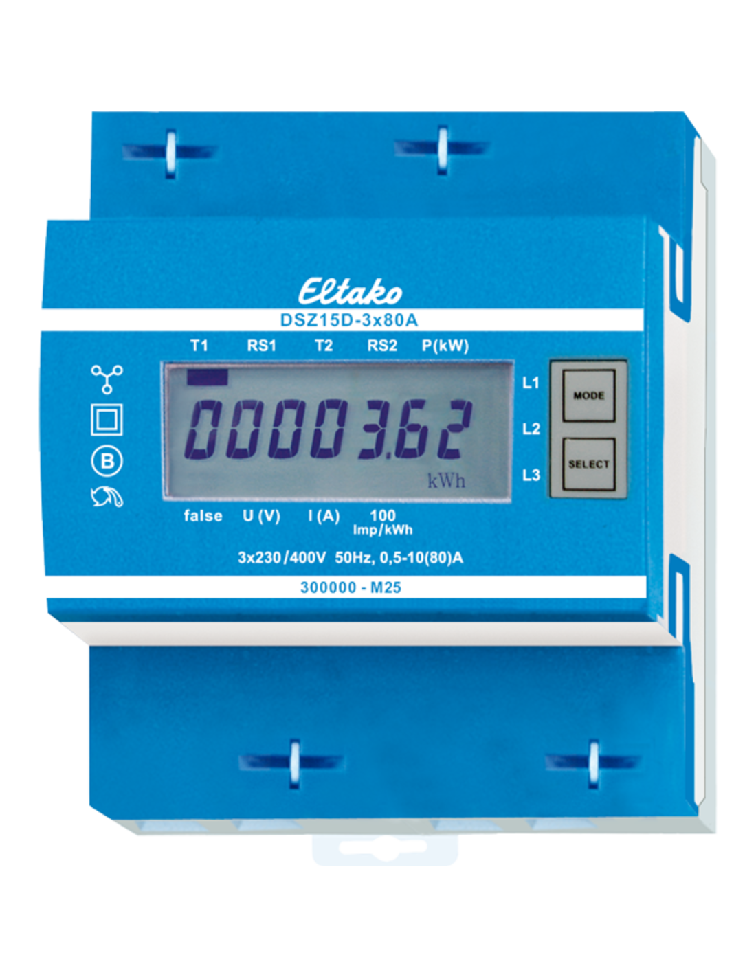Corrente massima 3x80 A. Consumo in standby solo 0,5 watt per fase. Dispositivo di installazione modulare per il montaggio su guida DIN-EN 60715 TH35. 4 moduli passo = 70 mm di larghezza, 58 mm di profondità. Classe di precisione B (1%). Con interfaccia S0. Misura l'energia attiva tramite la corrente tra ingresso e uscita. L'autoconsumo di solo max. 0,5 Watt di potenza attiva per fase non viene misurato e non viene visualizzato. È possibile collegare conduttori a 1, 2 o 3 fasi con correnti fino a 80 A. La corrente di avviamento è di 4O mA. La connessione N deve essere presente. Il display LCD a 7 segmenti può essere letto due volte in due settimane anche senza alimentazione. Il consumo energetico viene visualizzato sul display con una barra che lampeggia 100 volte per kWh. Di serie può essere utilizzato anche come contatore a 2 tariffe: applicando 230 V ai morsetti E1/E2 viene commutato su una seconda tariffa. A destra del display si trovano i pulsanti MODE e SELECT, utilizzati per scorrere il menu in base alle istruzioni per l'uso. Si possono quindi visualizzare l'energia attiva totale per tariffa, l'energia attiva della memoria azzerabile RS1 o RS2 e i valori istantanei di potenza, tensione e corrente per ogni conduttore di fase. Messaggio di errore (false): se non è presente alcun conduttore di fase o se la direzione della corrente è errata, sul display vengono visualizzati 'false' e il conduttore di fase corrispondente.